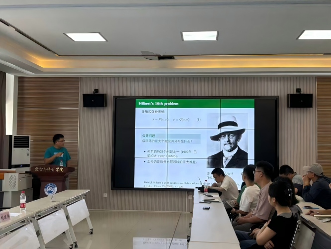孙宪波教授作了题为《Heteroclinic bifurcation near a loop tangent to an invariant line》的学术报告。以著名的Hilbert的第16问题为切入点,系统介绍了这一百年数学难题的研究历程和最新进展。他通过生动的讲解,向师生们展示了国内外学者在该领域的前沿工作和尚未解决的关键科学问题,并运用数学软件绘制出精美的数学图像,直观呈现了复杂的动力学行为。