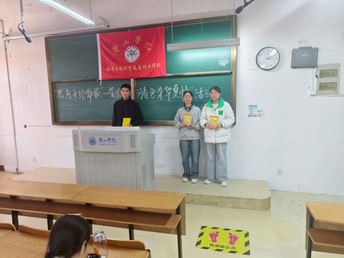 在活动过程中,参与者提前准备好作品,并在易班优课中线上文化自信课群中上传在线作业,评委团会进行评分,评选一等奖两名、二等奖三名、三等奖四名。活动现场,参与者按照活动通知在规定时间内带上自己的作品到达活动指定教室(1201)并进行纸质签到。签到结束后,由主持人公布获奖名单后,获奖者现场分享作品的设计理念和寓意。对于各自的作品大家都有独特的想法,相同的是,大家都将家国情怀与个人创意相结合,用色彩和构图表达对祖国深厚的情感,获奖者们脸上洋溢着灿烂的笑容。